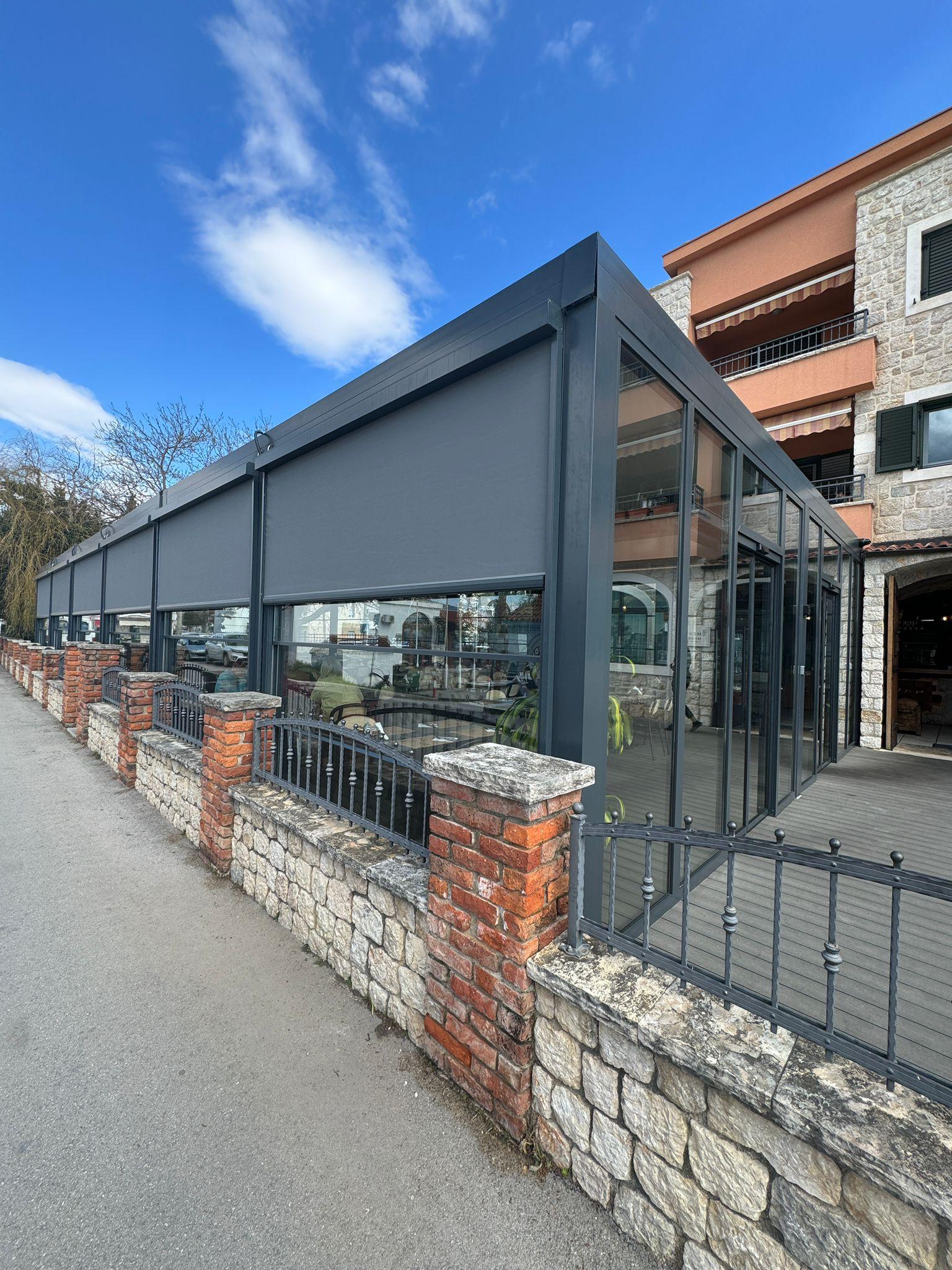 Dodaci i opcije – zip sistemi za bočne strane i plafone, stakleni sistemi (klizni, gilotinski, harmonika) i dekorativni završni elementi.